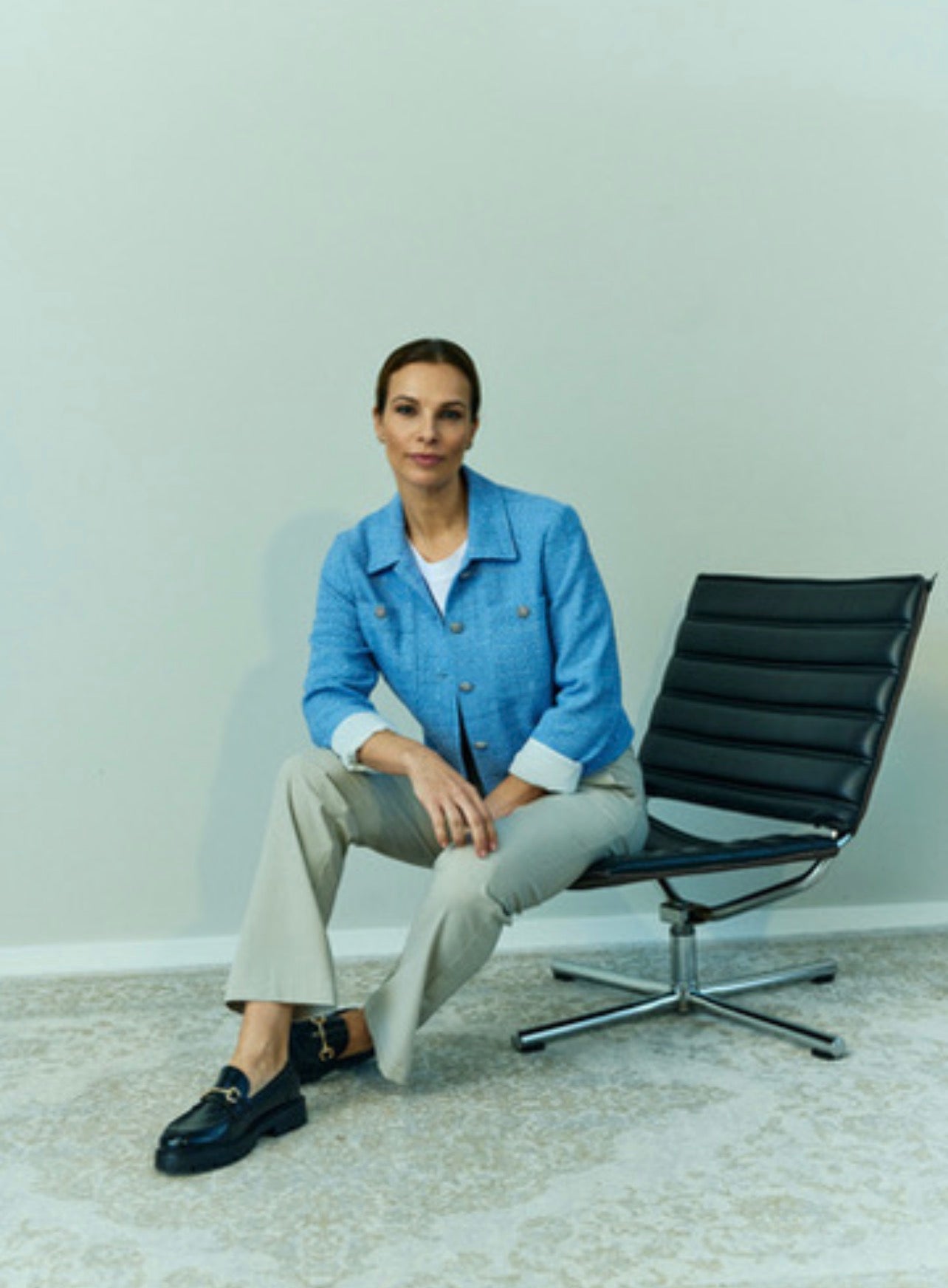 Blazer fra Claire med sølv knapper. Den er kort i modellen og har to bryst lommer.