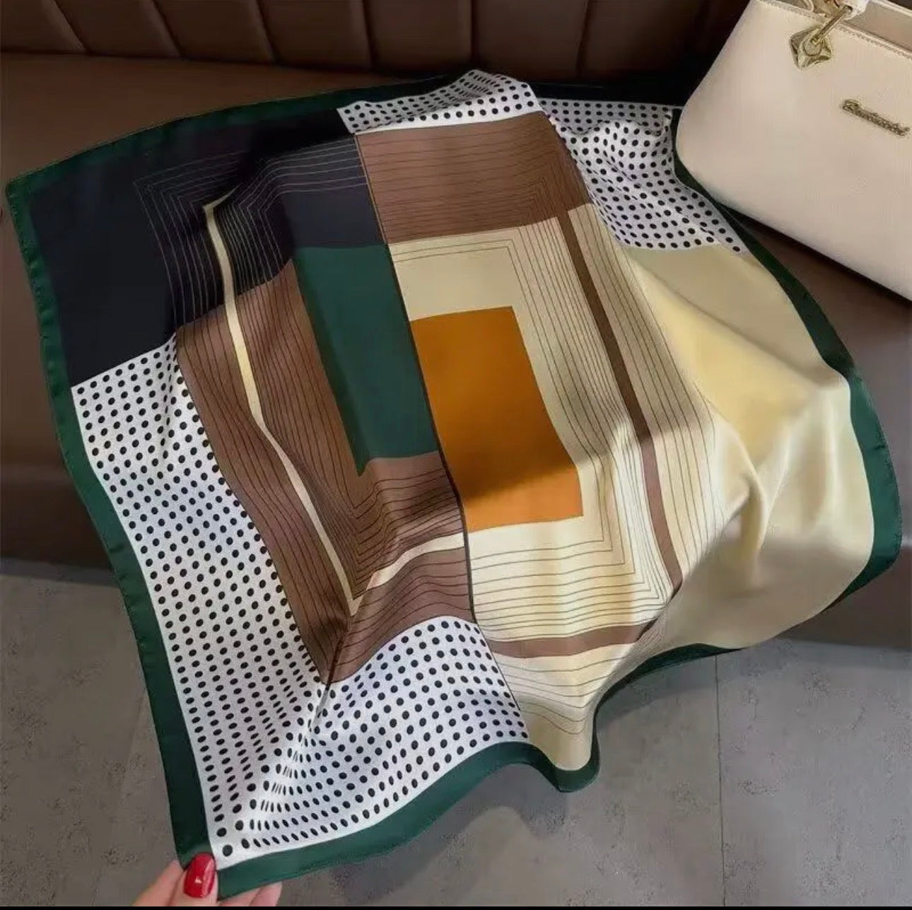 Skjerf med et lekkert mønster. Str 70x70. Myk og slikeaktig følelse. 100% polyester