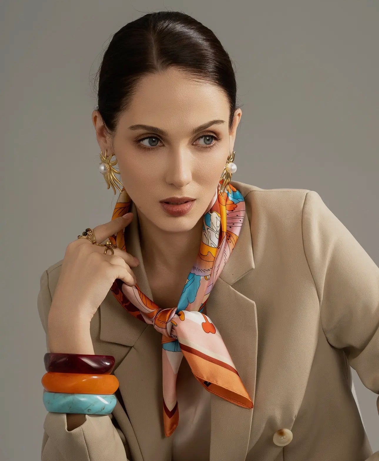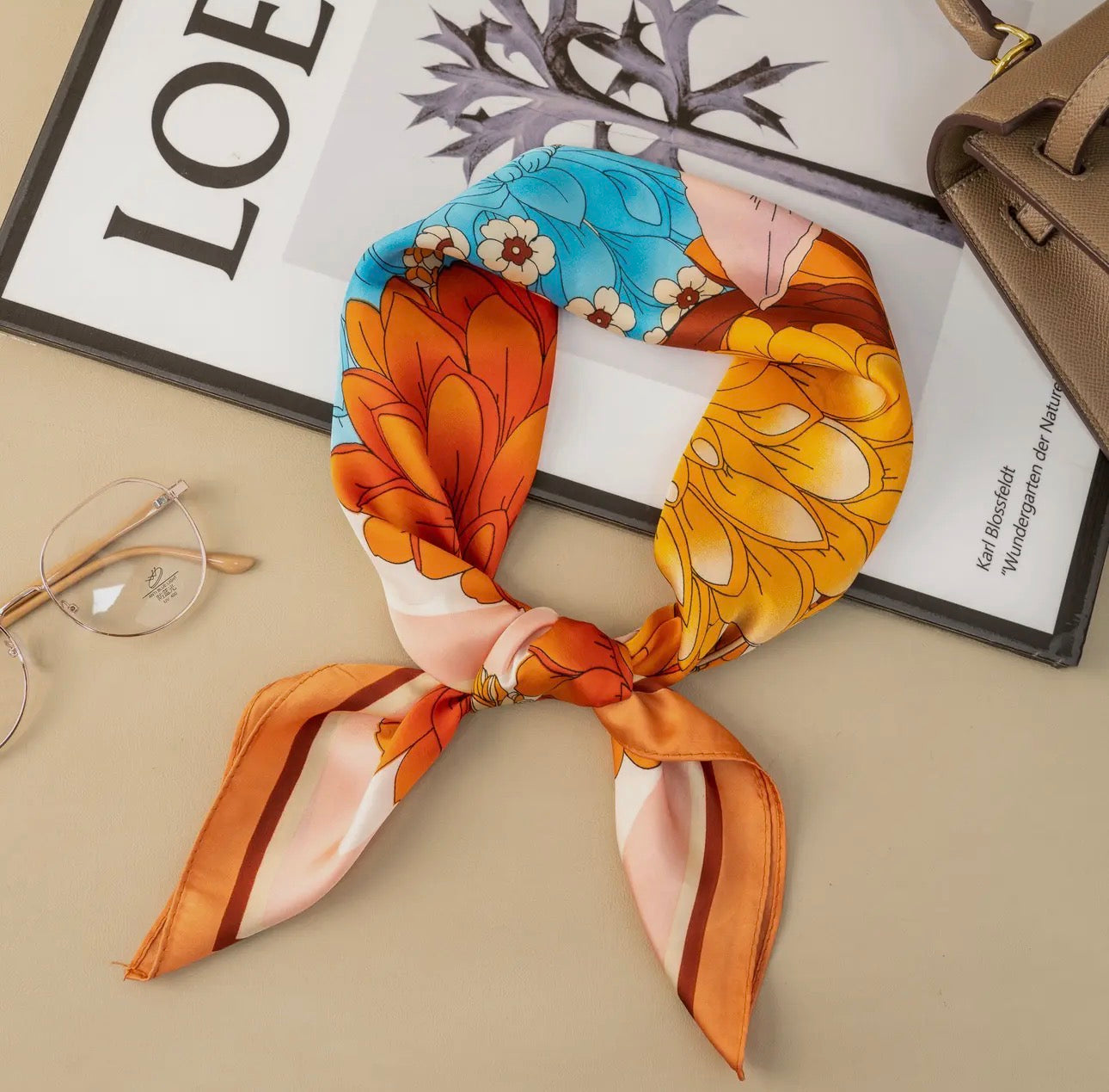 Skjerf med et lekkert mønster. Str 70x70. Myk og slikeaktig følelse. 100% polyester