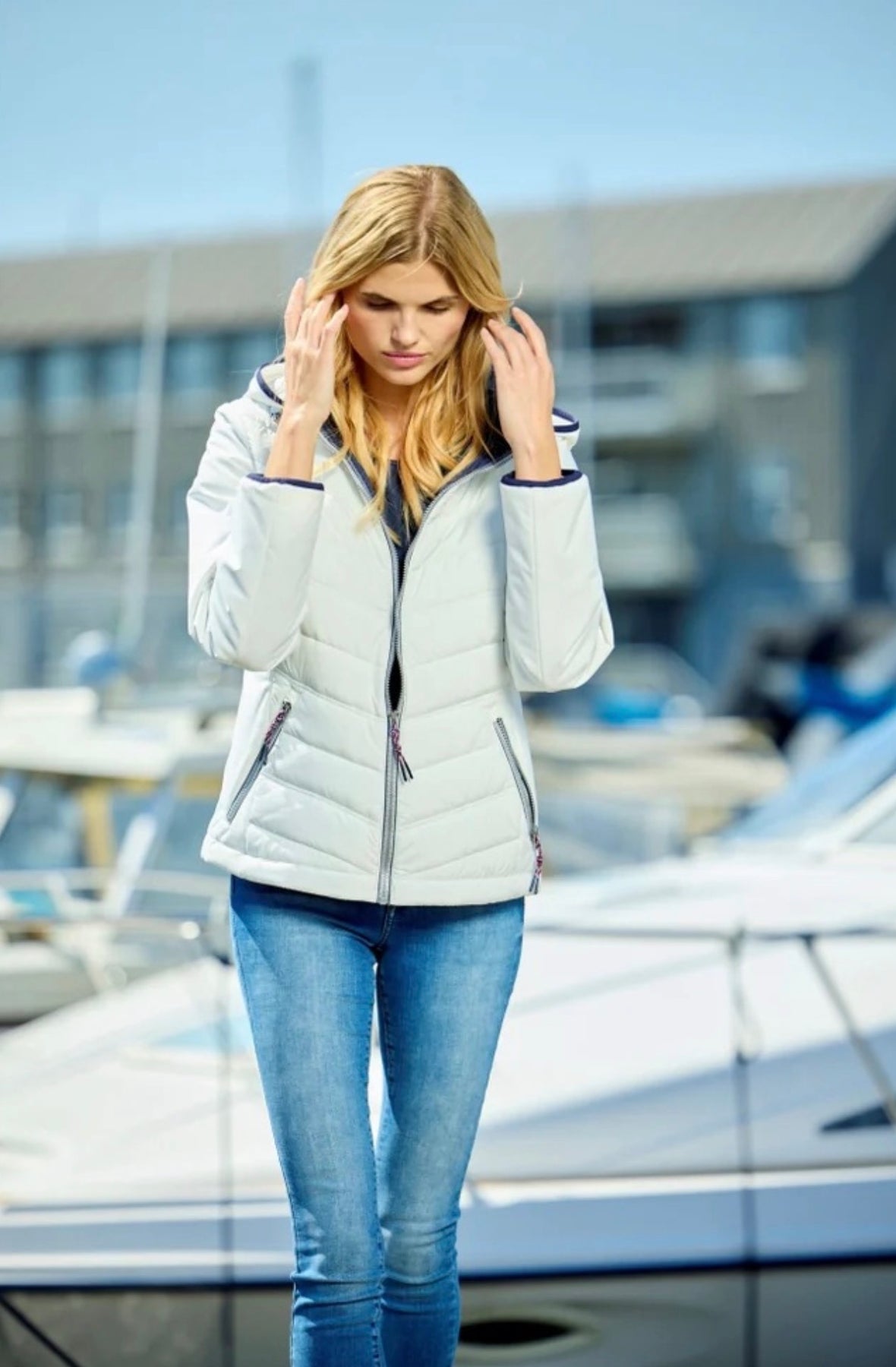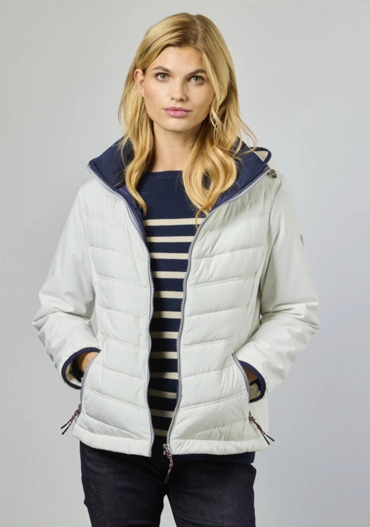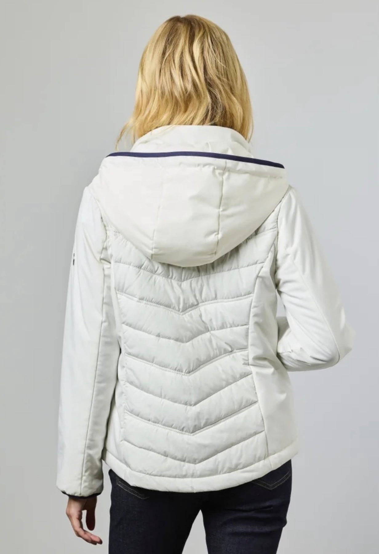Denne fine hybridjakken blander feminint design med moderne funksjonalitet.