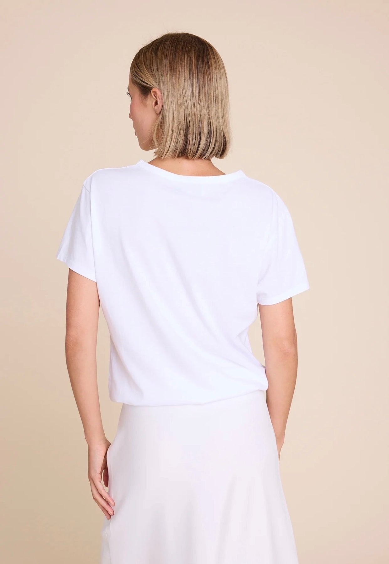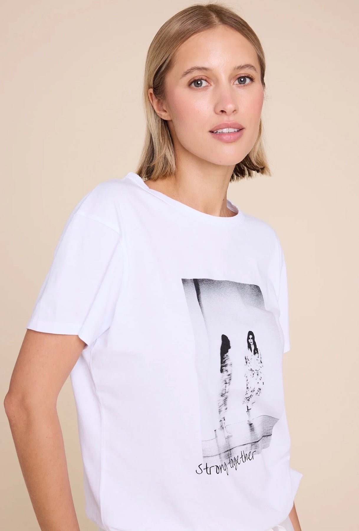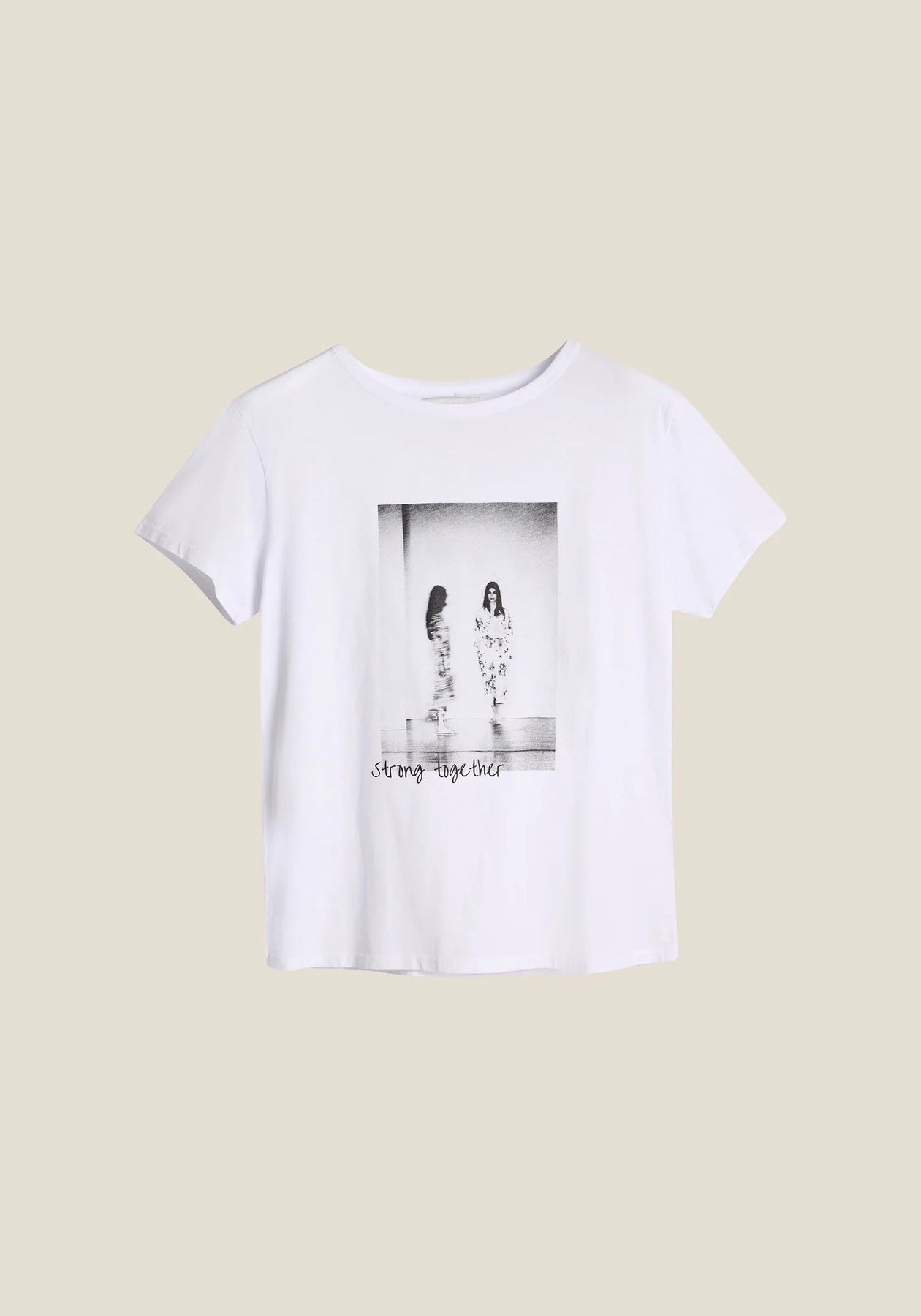 Den er designet med en klassisk rund hals, og en flatterede rett passform. Den har et statement-trykk som gjenspeiler kolleksjons visjon "Sterkere sammen"!