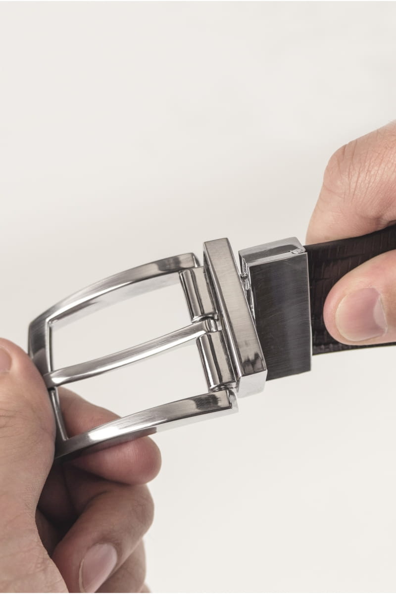 Belte som kan snues fra Meyer. Brunt på den ene siden, og sort på den andre.