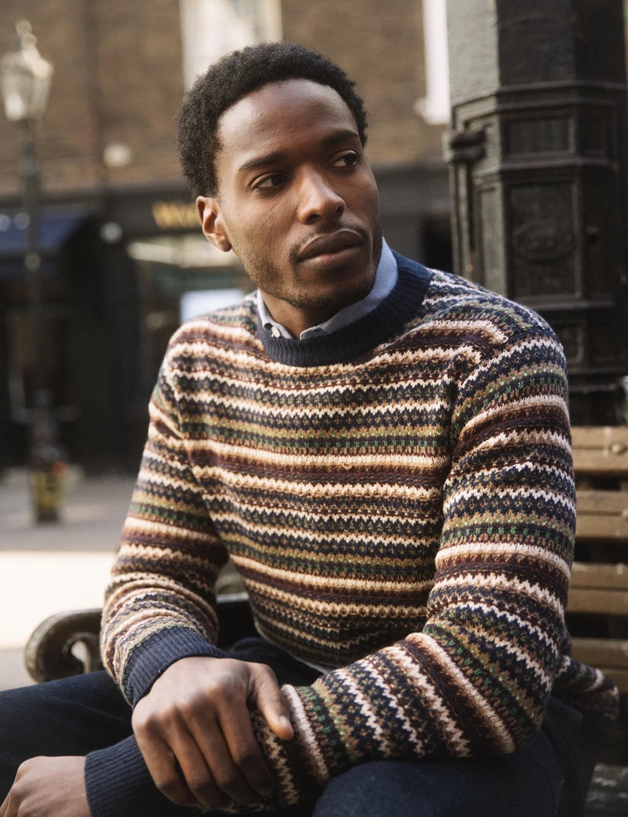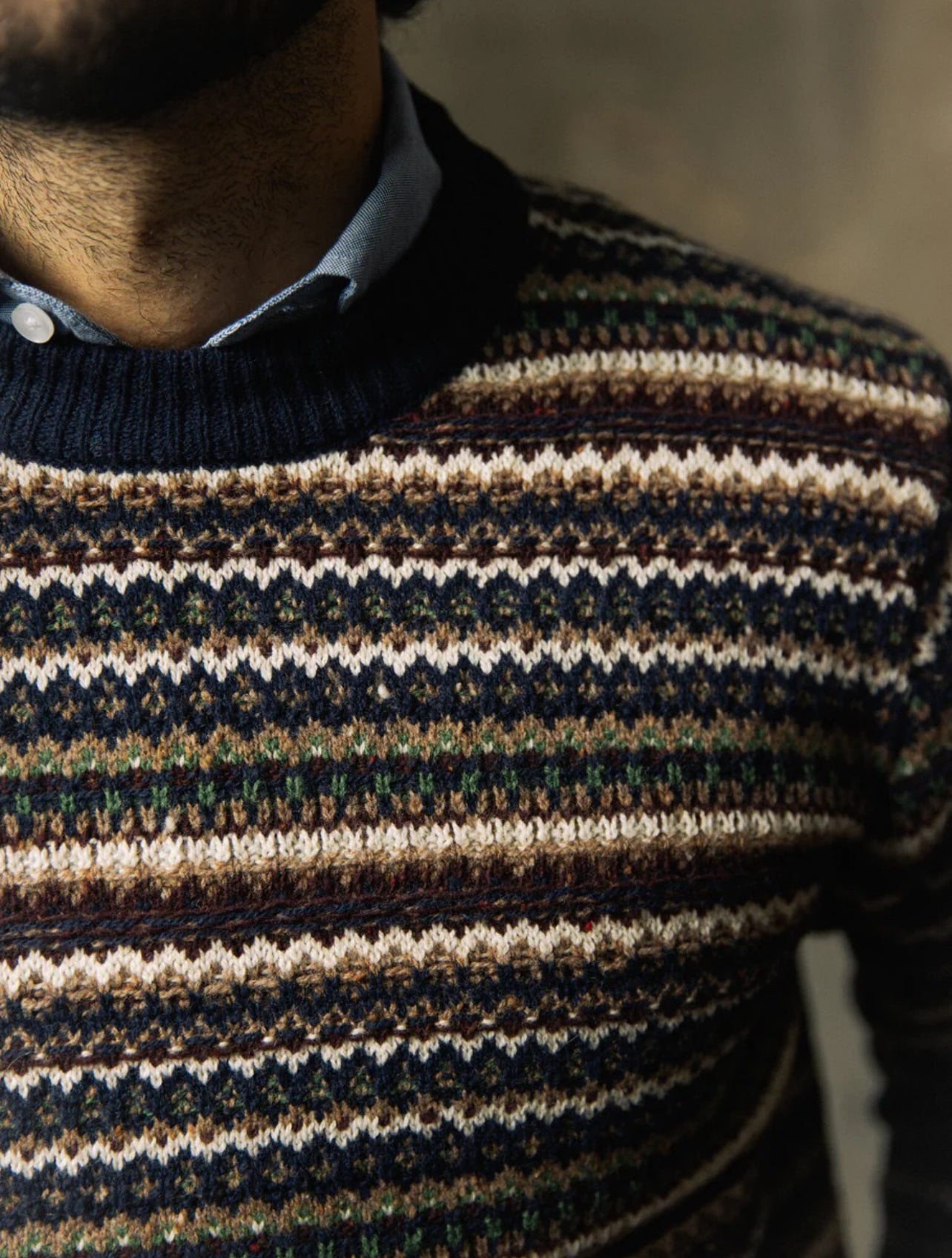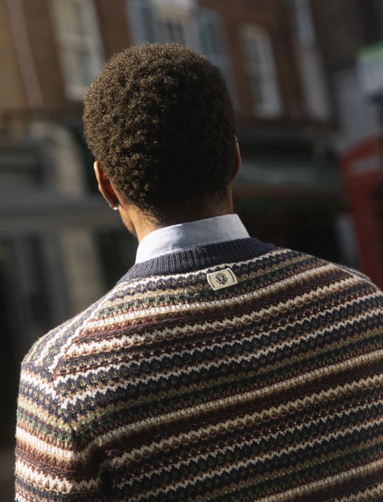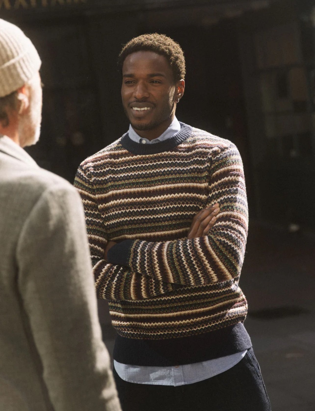 Denne flotte genser fra Mos Mosh skiller seg ut med sitt flerfargede stripe mønster. Den har ribbekanter og en liten logo bak i nakken. Perfekt for kjølige dager.