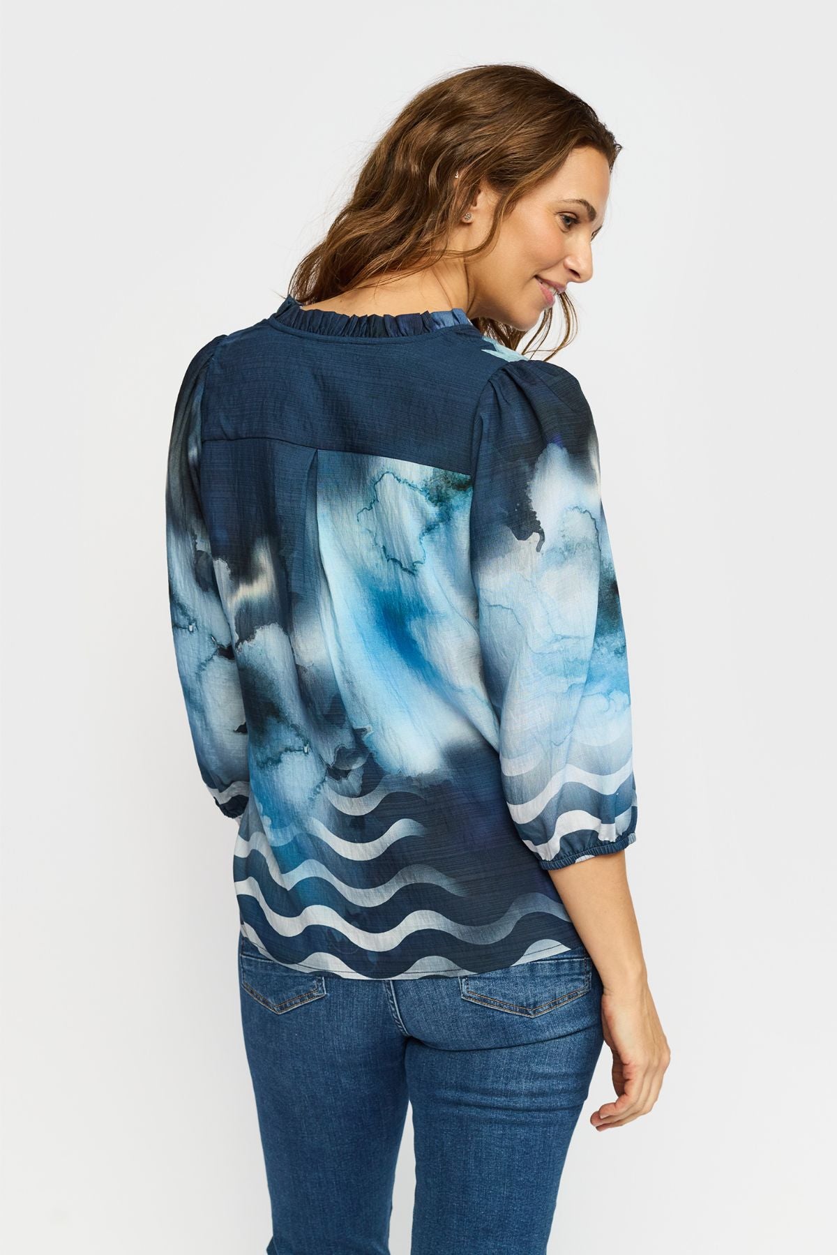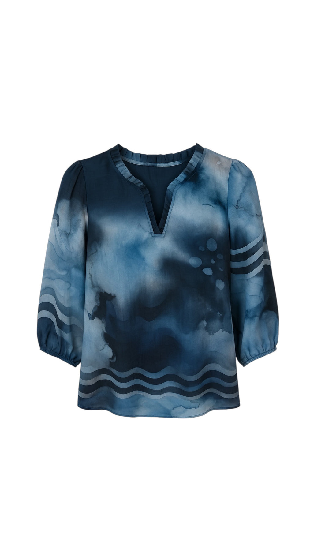 Elegant bluse med 3/4 ermer og V-hals, prydet med ruffle detaljer som gir et feminint preg. Denne blusen er perfekt for å tilføre et stilfullt element til garderoben din.