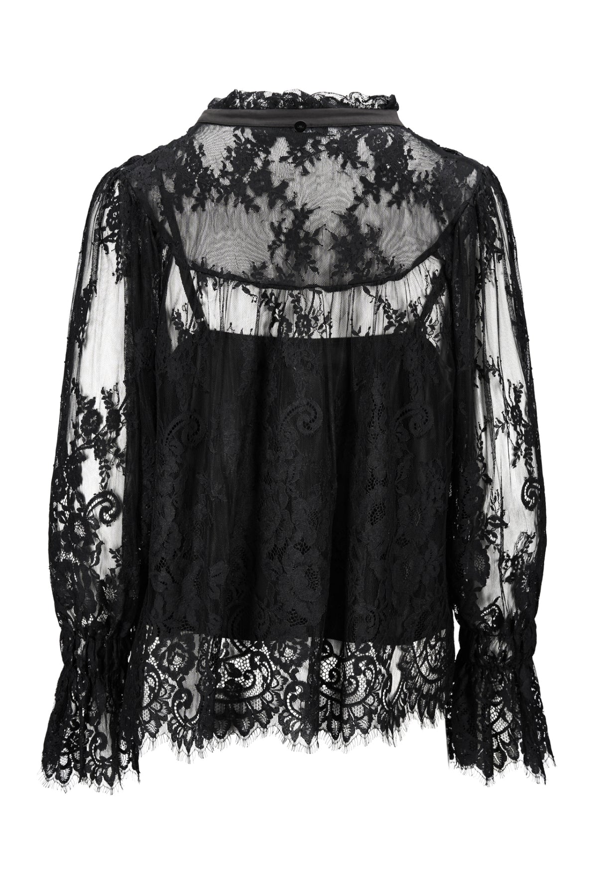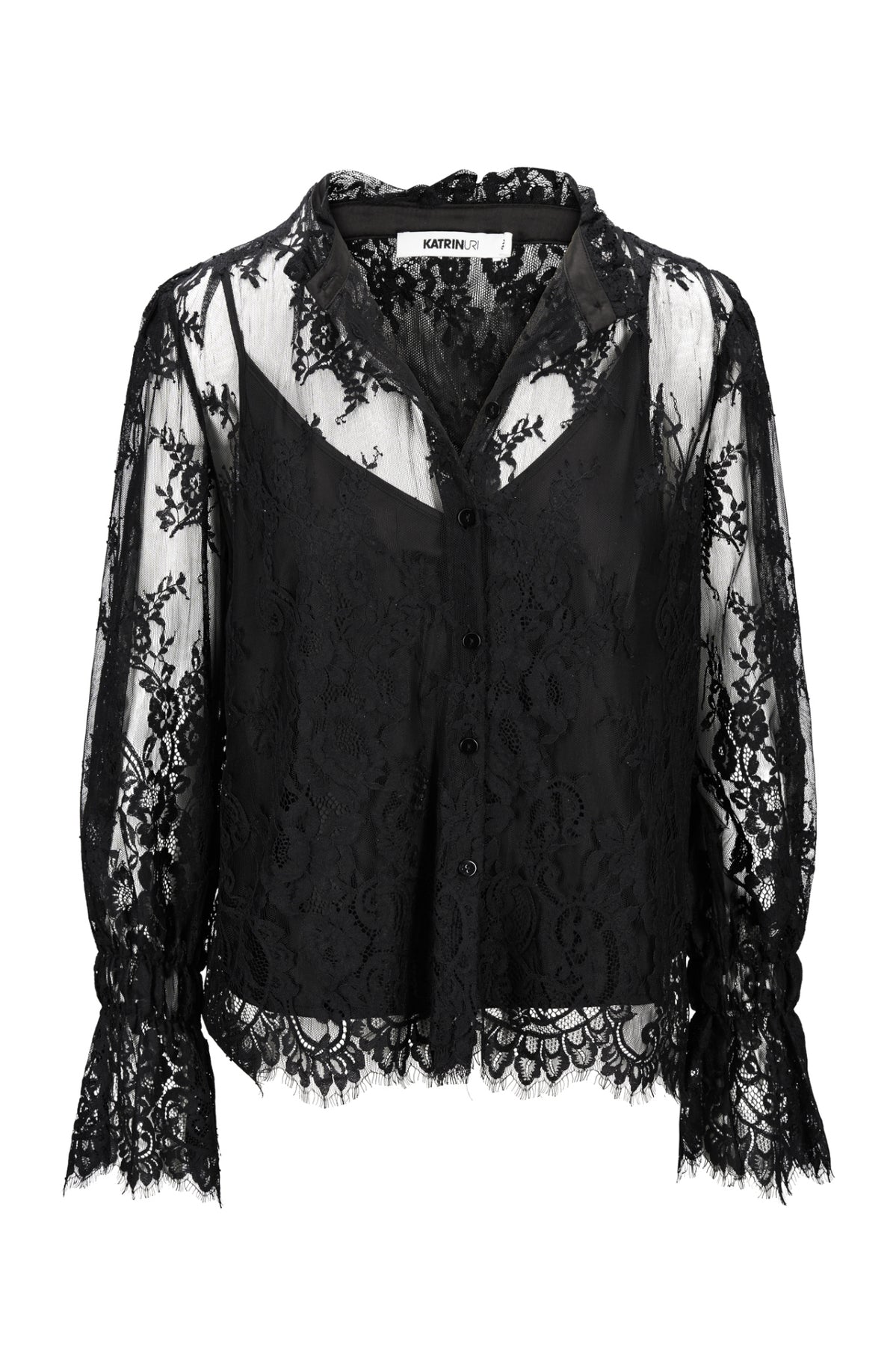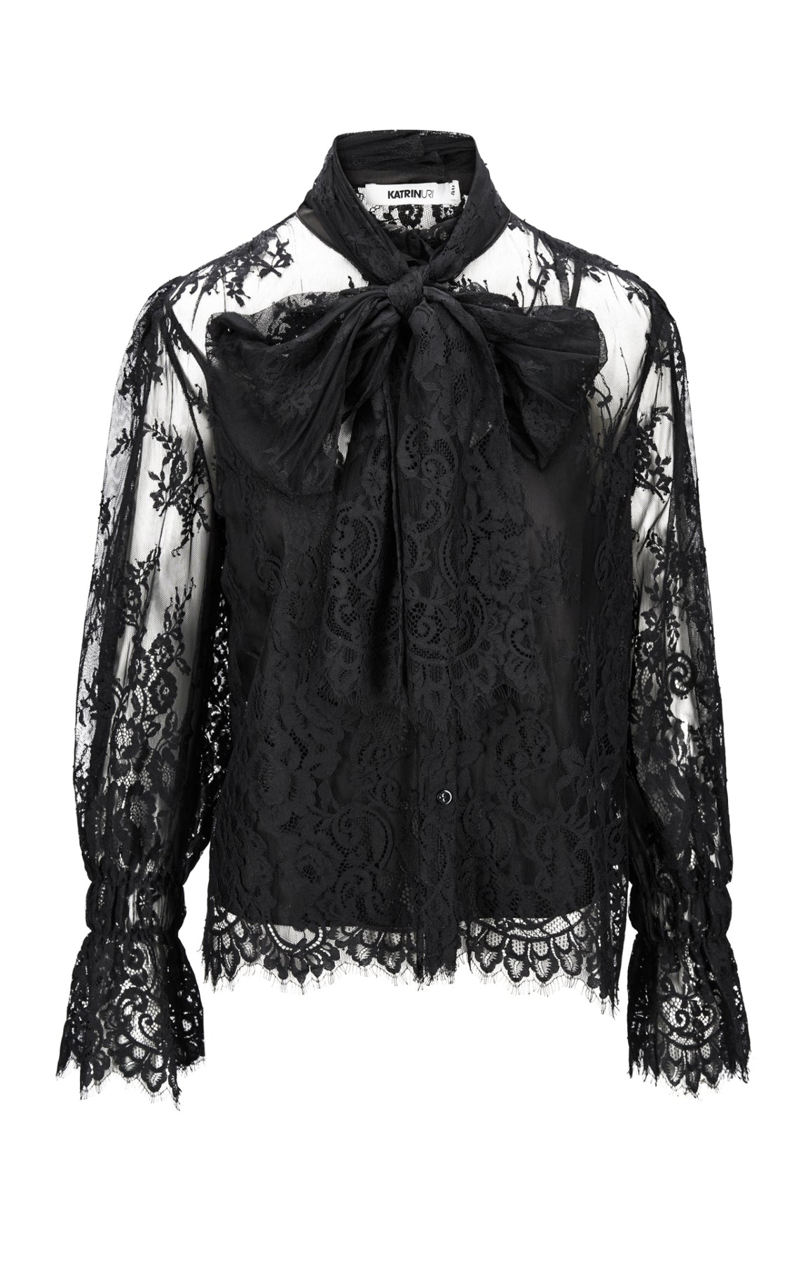 Nydelig bluse fra Katrin Uri i blonder. Den har knapper foran og litt halvhøy hals. Sløyfe som kan tas av er festet i nakken med en knapp.