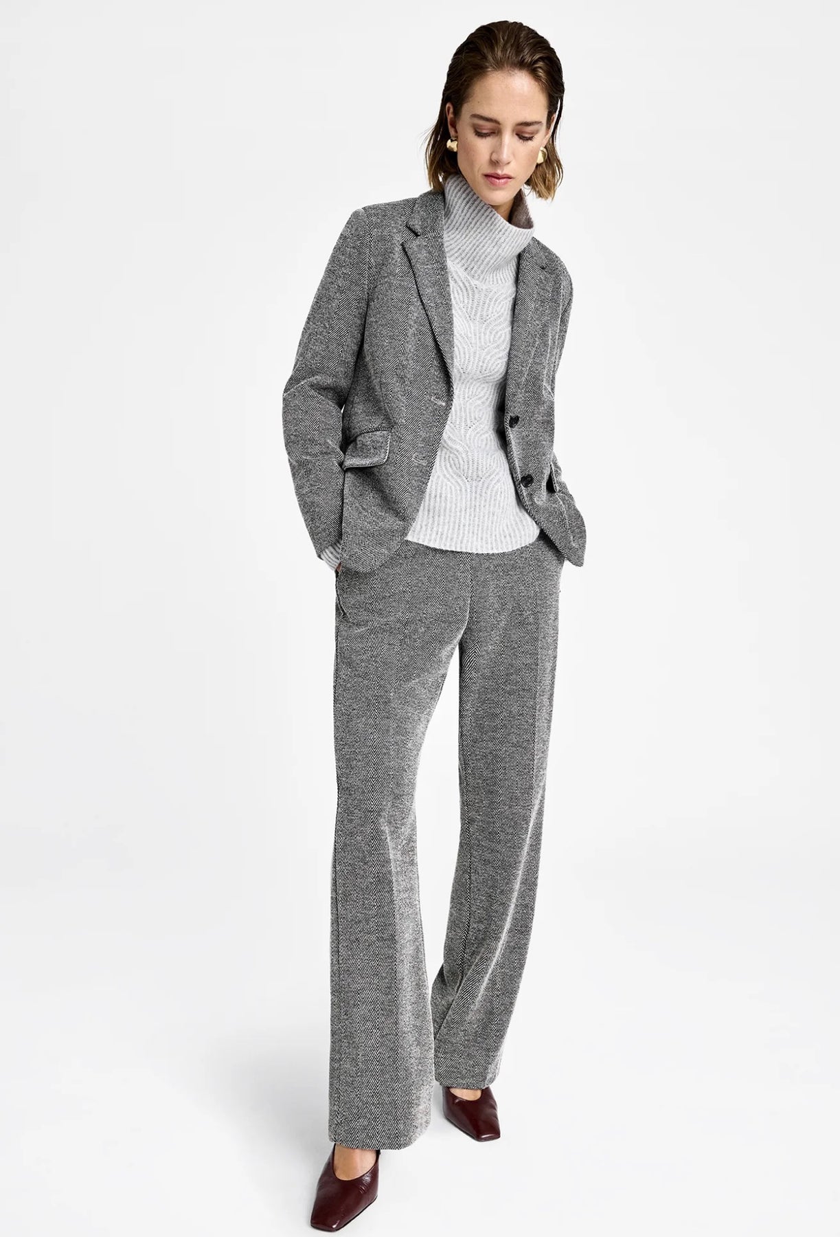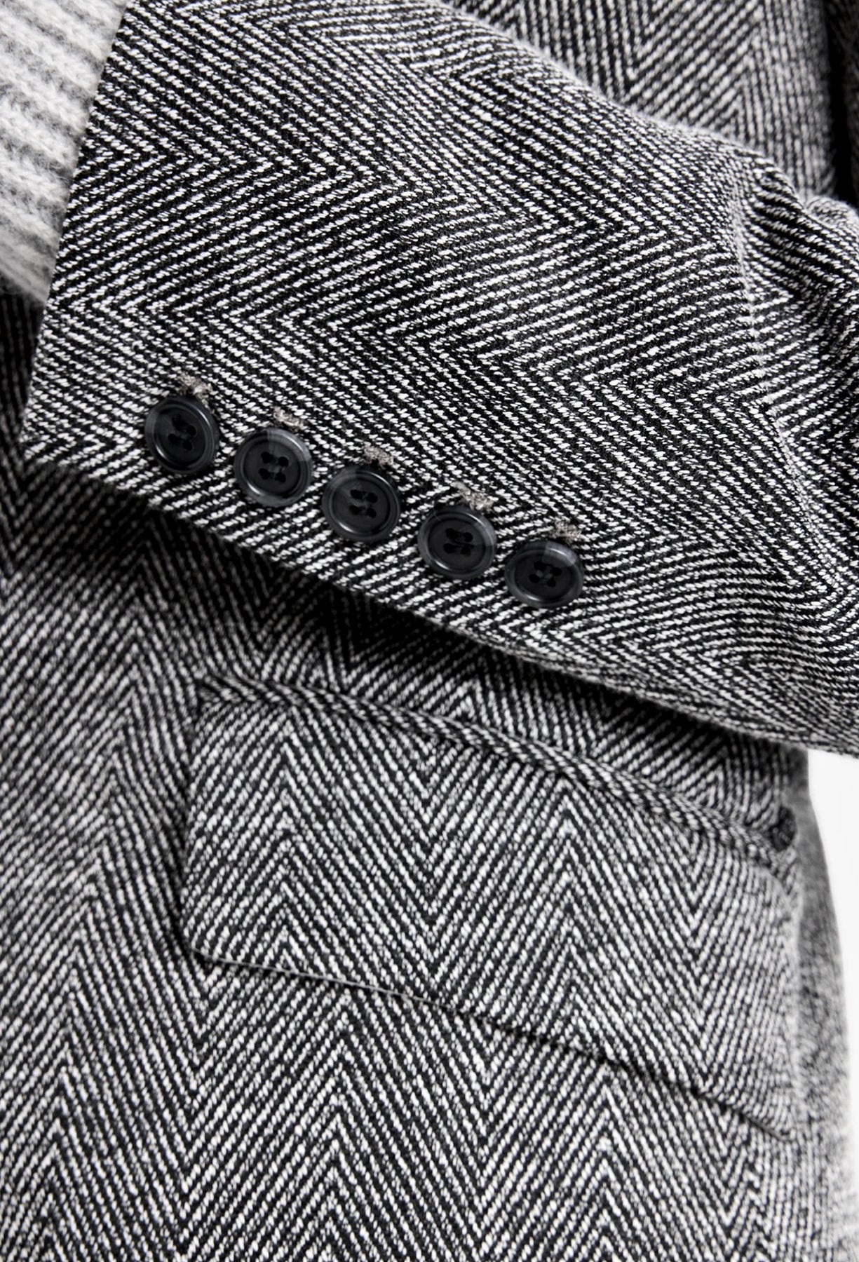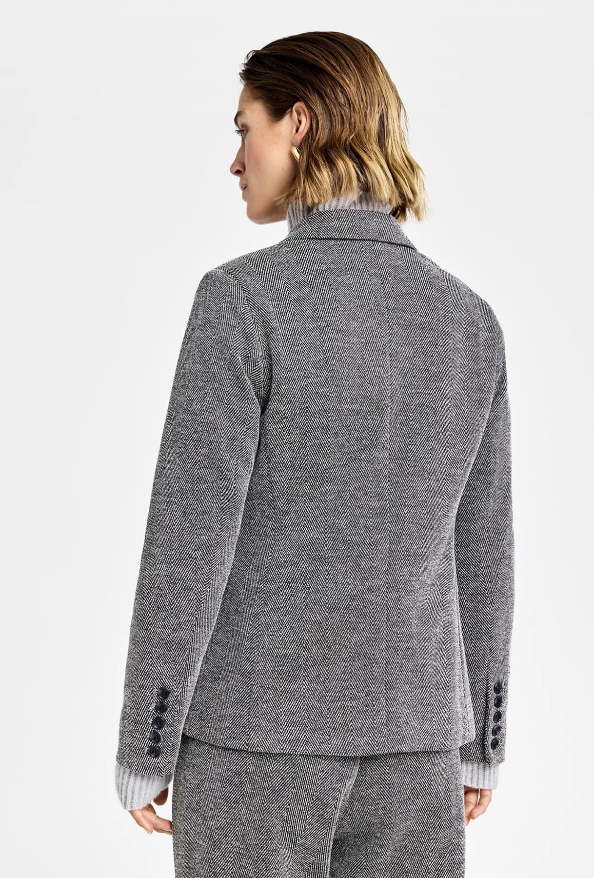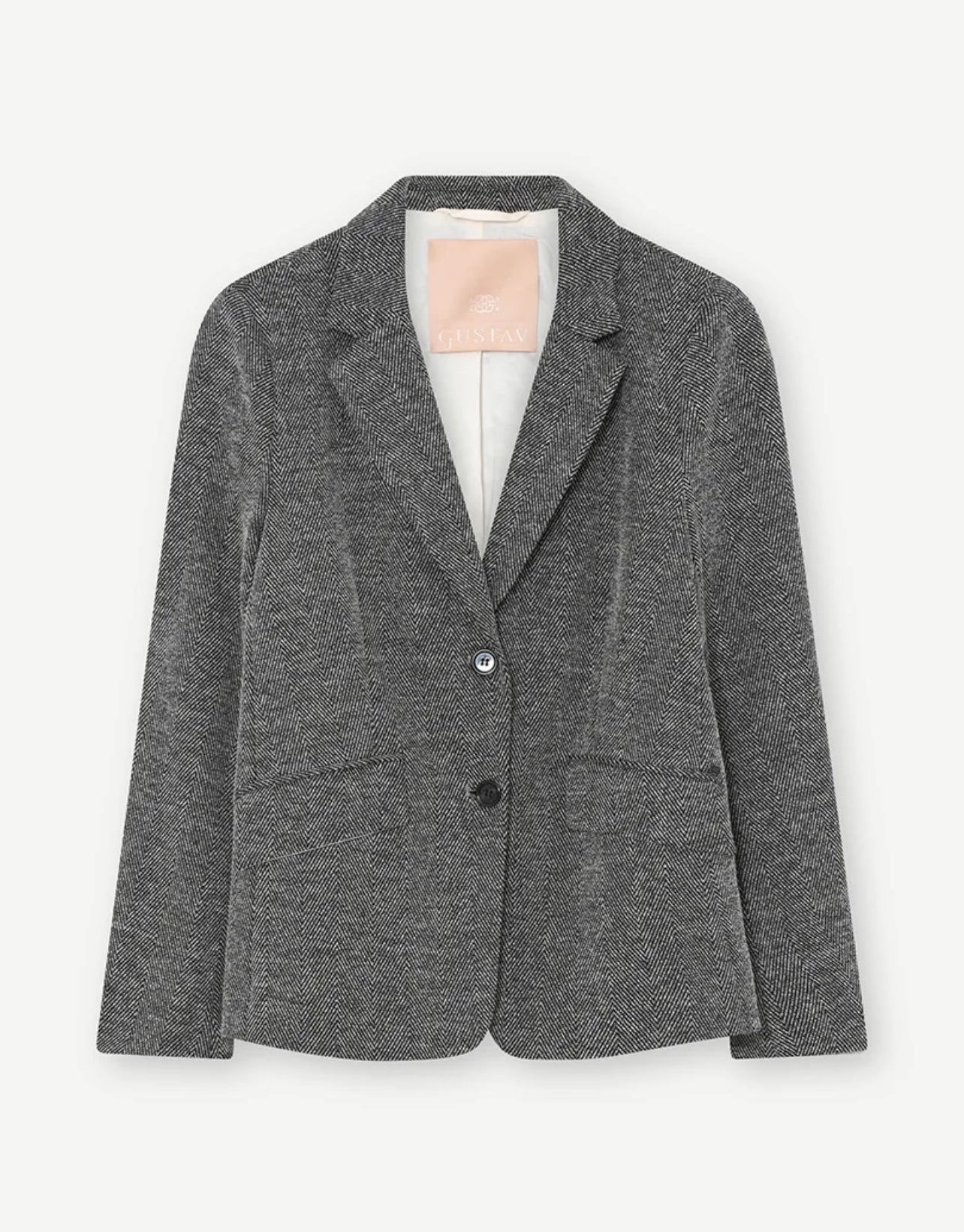 Blazer fra Gustav med fiskebeinsmønster. Den har to knapper foran til lukking og en lomme med klaffer på hver side.